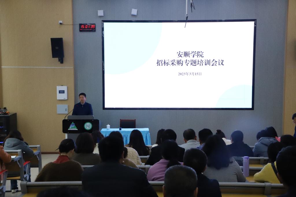 3月15日下午,安顺学院在安道楼102阶梯教室召开招标采购专题培训会议。安顺学院党委副书记陶文彩主持会议,各部门(学院)负责人及采购工作具体经办人员参加会议。国有资产管理处工程招标科科长张秋就招标采购工作进行讲解。