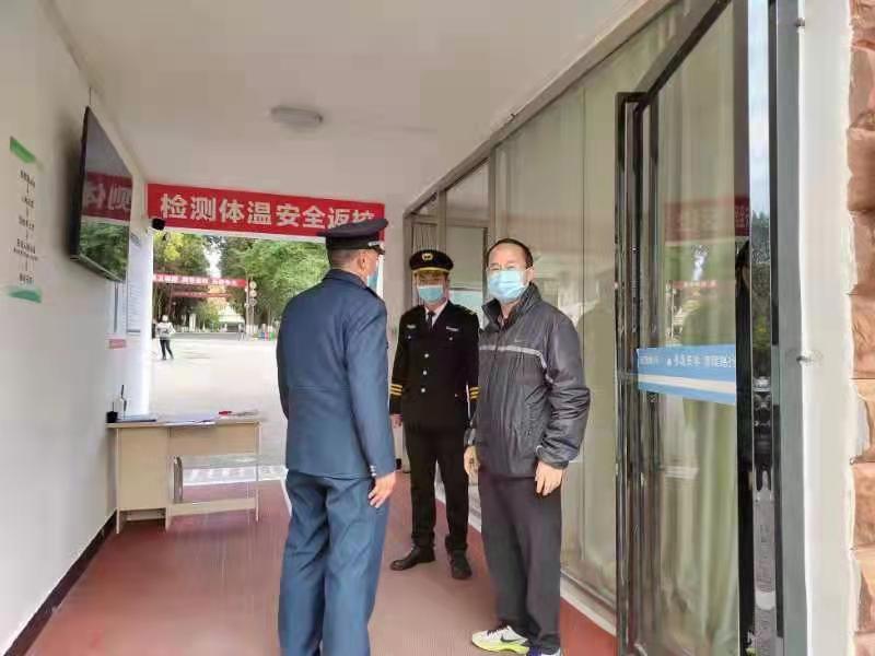 安顺学院党委书记罗荣彬(右)检查学校疫情防控工作