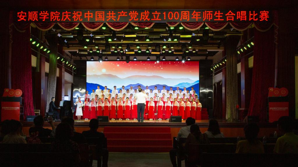 百年风雨兼程,百年卓越辉煌。为陶冶广大师生爱党、爱国、爱校的高尚情操,增强凝聚力,展现校园奋发进取的精神风貌,值此全国上下共同庆祝中国共产党百年华诞之际,6月28日下午,安顺学院在大礼堂隆重举办“教育初心展情怀•高唱赞歌跟党走”庆祝中国共产党成立100周年师生红歌合唱比赛。安顺学院党委书记罗荣彬,党委副书记、校长陈云坤,党委委员、副校长郭本华,党委委员、纪委书记蔡红英,党委委员、副校长韦英,党委委员、副校长 张来,党委委员、党委宣传部部长殷红敏,党委委员、教务处处长杜志明以及各职能部门、各二级学院负责人出席比赛。由全校各分工会组成的16支教职工代表队参加比赛。安顺学院艺术学院教授、中国音乐家协会会员、贵州省音乐家协会会员熊黏,中国合唱协会会员、贵州音乐教育研究会理事、安顺市音乐教育研究会副会长段剑,安顺市教育科学研究所音乐教研员、贵州省教育学会理事、安顺市音乐教育专业委员会副理事长、安顺合唱协会副会长陈洪刚,安顺市第二高级中学音乐高级教师、市级名师工作室主持人、市教育学会音乐教育分会副会长吴玛丽,安顺市第三高级中学音乐一级教师、贵州省合唱协会会员、安顺合唱协会理事会理事陈兴余担任比赛评委。