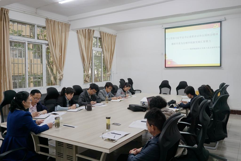 2018年5月2日上午,党委委员、副院长熊国敏教授以《学习习近平总书记重要讲话和全国两会精神 履职尽责为安顺学院新发展汇智聚力》为题给机关党总支第八党支部全体党员上党课。